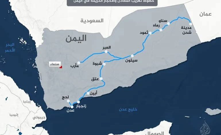 تصميم خاص – خريطة خطوط تهريب المعادن والأحجار الكريمة في اليمن