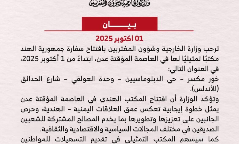 ترحب وزارة الخارجية وشؤون المغتربين بافتتاح سفارة جمهورية الهند مكتبًا تمثيليًا لها في مدينة عدن، ابتداءً من اليوم1 أكتوبر 2025.
