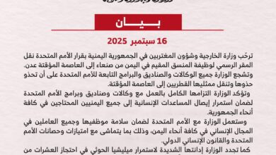 رحبت وزارة الخارجيه بقرار الأمم المتحدة بشأن نقل المقر الرسمي لوظيفة المنسق المقيم في اليمن ، من صنعاء إلى…