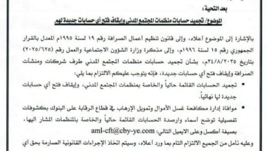 البنك المركزي يجمد حسابات منظمات المدني ويوجه بإيقاف فتح اي حسابات جديده